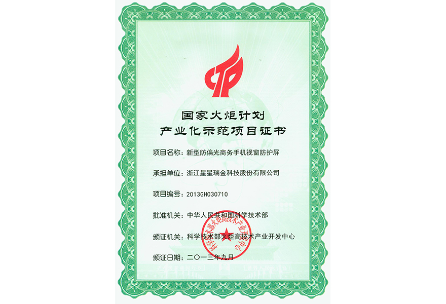 11.2.1-27國家火炬計劃產業(yè)化示范項目證書(新型防偏光商務手機視窗防護屏)2013年9月