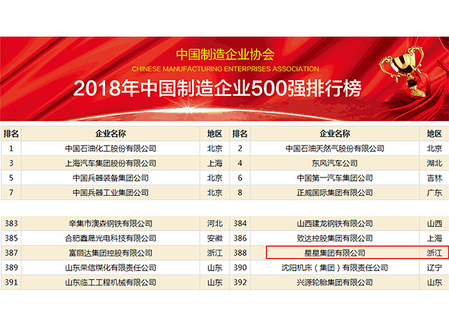 近日,2018年中國制造企業500強暨中國裝備制造業100強排行榜發布,星星集團名列第388位,較去年的404位進步了16位。