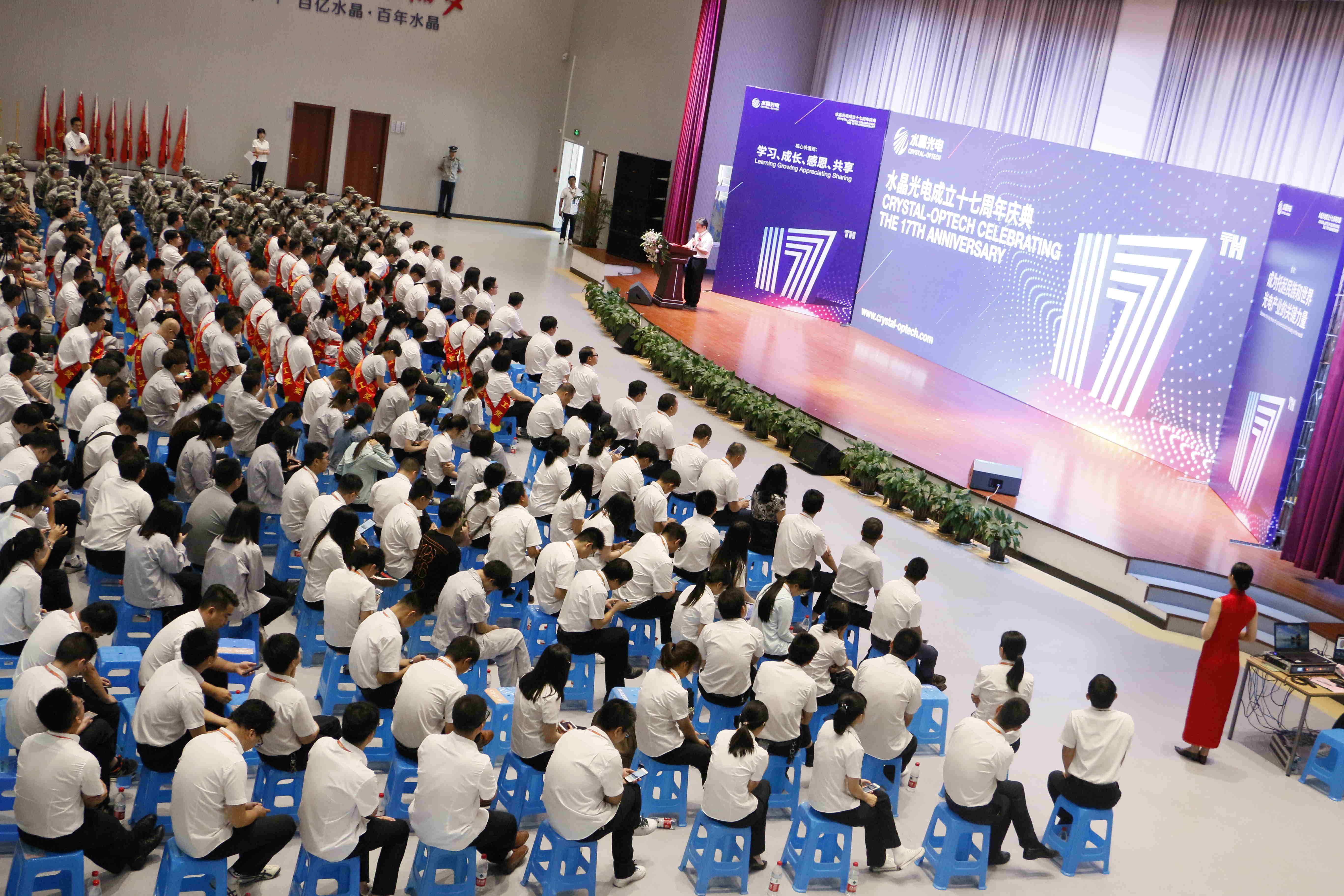 8月2日,公司在綜合樓三樓舉行了水晶光電成立十七周年慶典。公司董事長林敏,董事、總經理王震宇等領導班子以及公司各職能中心和事業部、分子公司的領導和員工代表參加了此次活動。董事會辦公室主任、水晶商學院執行院長印鋒主持大會。